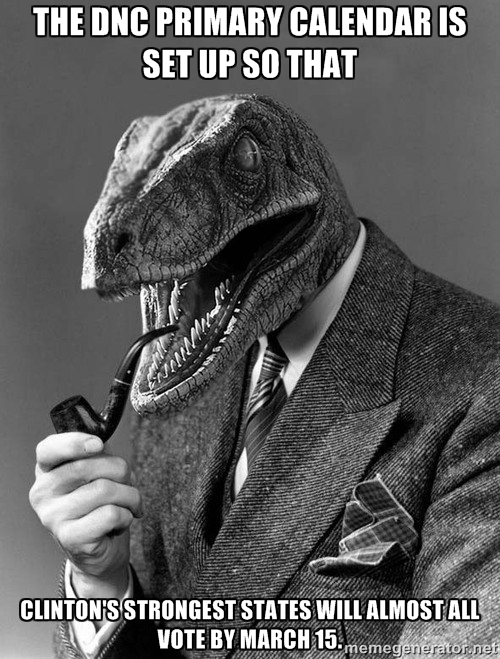 I'm keeping this short to put a very simple idea into your head. Because of the way the Democratic Party voting calendar is structured this year, Clinton's largest lead will occur on March 15. After that, most of Sanders' strongest states will vote.
