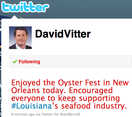 I follow David Vitter's smug idiocy on twitter so you don't have to. Mostly he tweets about what a strong family-oriented guy he is-- his poor son Jack has become a twitter campaign prop regarding countless sporting events and outings ever since Vitter got trashed for a series of illicit affairs with prostitutes in Louisiana and Washington-- about the benefits of obstructionism, about Louisiana sports teams, about how beloved he is of right wing propaganda hypocrites like Limbaugh, Hannity, Glenn Beck and O'Reilly, and lately, in at least three-quarters of his tweets, the BP oil spill. Except that he isn't a lady, one can't help but conjure up the third act of Hamlet: