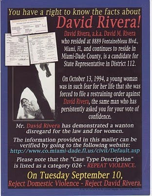"David Rivera's efforts to cover-up domestic abuse allegations are beyond troubling, especially to women," said Florida Democratic Party spokesperson Eric Jotkoff. "Rivera has lied to South Florida's families about everything-- from denying he knows the victim in the case, to contradicting the facts within the 'Truckgate' police report. The last thing we can afford is another scandal-plagued career politician in Washington who will say and do anything to get elected-- especially when it involves shameless lying and reckless behavior."