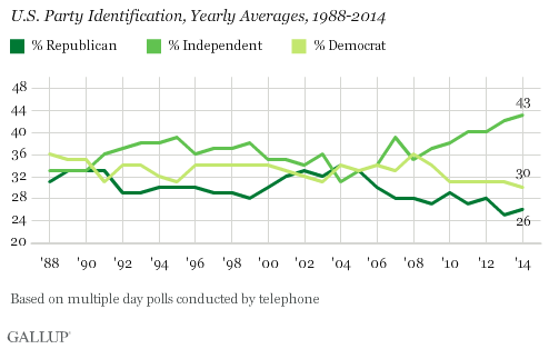 The recent rise in political independence has come at the expense of both parties, but more among Democrats than among Republicans. Over the last six years, Democratic identification has fallen from 36% -- the highest in the last 25 years -- to 30%. Meanwhile, Republican identification is down from 28% in 2008 to 26% last year....The pollsters speculate on the reasons for this "dissatisfaction with government," using language like "this is likely due to..." etc., most of which involve standard-issue conventional thinking — "what everyone knows to be true" because the media repeats it constantly. For example, "partisan gridlock" comes up as one of the guesses. (A much-repeated conventional explanation, but inaccurate — on matters that matter to the 1%, there is no gridlock, as any neutral observer can see, unless party rebels block a bipartisan move like cutting Social Security benefits.) The polling itself is accurate though and should not be dismissed.