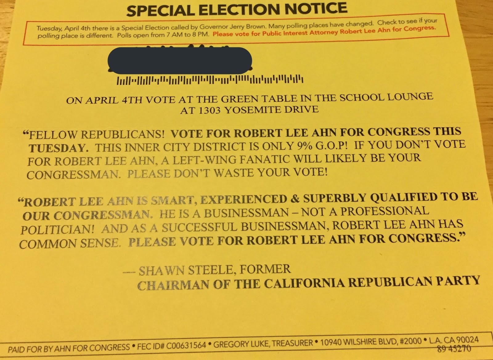 I was reading the LA Times article on April 19th and was surprised when I read that Robert Lee Ahn was a former Republican. While I can’t blame him for deserting the Republican Party, I seemed to have remembered seeing something different on his candidate statement. So I went back to look at the candidate statement, and I was right: