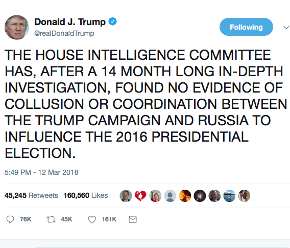 On Saturday, Trumpanzee was at it again: "The Mueller probe should never have been started in that there was no collusion and there was no crime."