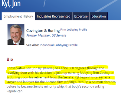 Kyl's first vote is likely to be on confirming Brett Kavanaugh-- an obvious conflict of interest, since he has been Kavanaugh's "sherpa" for the confirmation process. Obviously Ducey wasn't looking for a maverick, just someone to vote to confirm Kavanaugh and kill Obamacare. And a bonus in case anything comes up for Kyl's lobbying clients, Merck, Northrop Grumman, PHARMA, Raytheon and Walmart.