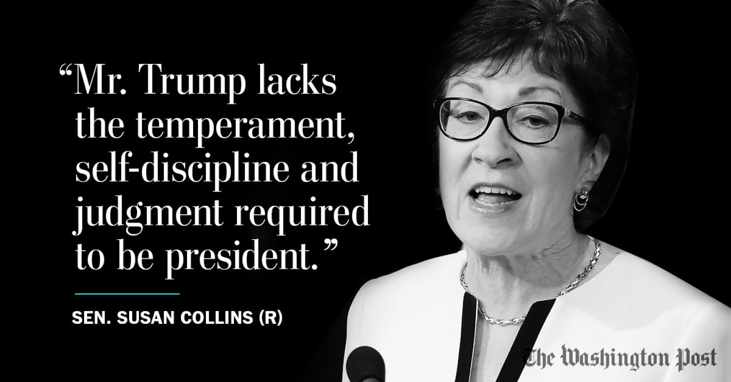 But now she's concerned? Was she not paying attention for the last coupla years? Who, oh, who could have guessed Trump would interfere with the investigation? Or that there is a single normal Trump would hesitate to break? Susan Collins is concerned. She's going to be a lot more concerned when she's on the ballot with him in 2020.