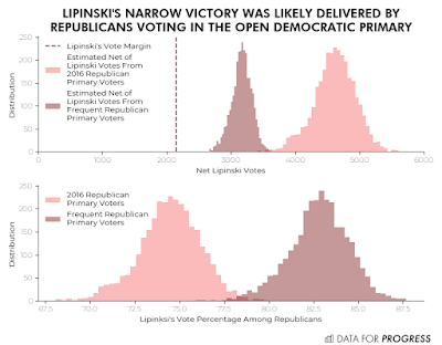 Last year, Marie Newman was about to beat him when Mark Penn and his wife, Nancy Jacobson, laundered nearly a million dollars from wealthy Republicans-- like the Murdoch family-- and other conservatives to fund a last minute smear campaign against Marie so they could save Lipinski's scrawny neck. Earlier this week Sean McElwee's Data For Progress explained another way how it was Republicans who delivered Lipinski his narrow win in 2018. "There's no party registration in Illinois, meaning that primaries are open to any registered voter. This often leads to strategic voting, where Republican partisans vote in Democratic primaries and vice versa. Despite having no party registration, we can still get a good sense of whether someone is a Republican based on their primary voting history... [T]here were about 5,000 frequent Republican primary voters in the 2018 Democratic primary, about 5 percent of the electorate... [which] would entirely account for Lipinski’s narrow win margin."