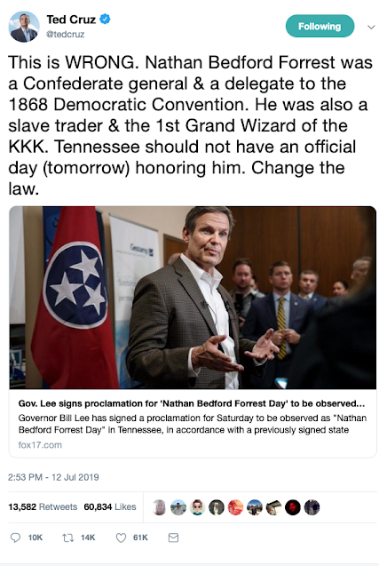 Has anyone connected Trump's penchant for putting women and children into concentration camps with his German ancestry? Maybe instead of slamming these 4 women of color working for all of us in Congress, Trump should join Ted Cruz in condemning therapist Republican governor of Tennessee for honoring the founder of the KKK. Because of Bill Lee's proclamation, Saturday was officially Nathan Bedford Forrest Day in Tennessee, as it has been since 1921.